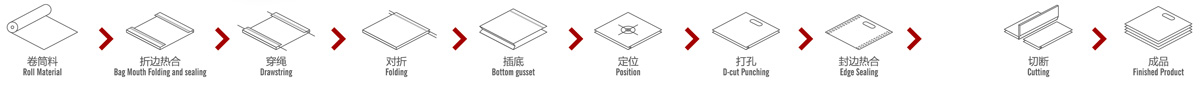 工序流程: 卷筒料---- 折邊---- 穿繩---- 熱合---- 對折---- 插邊---- 定位----- 打孔---- 熱合---- 切斷- 收集成品。