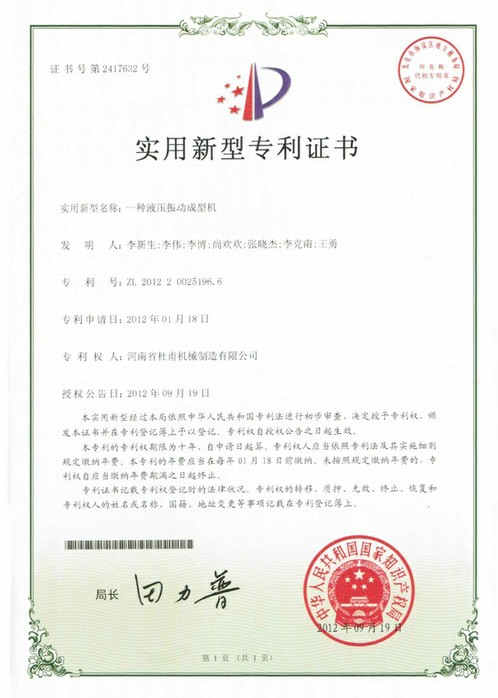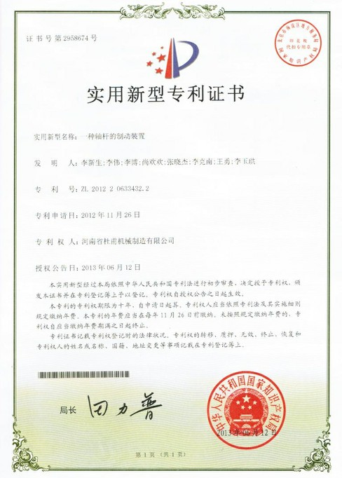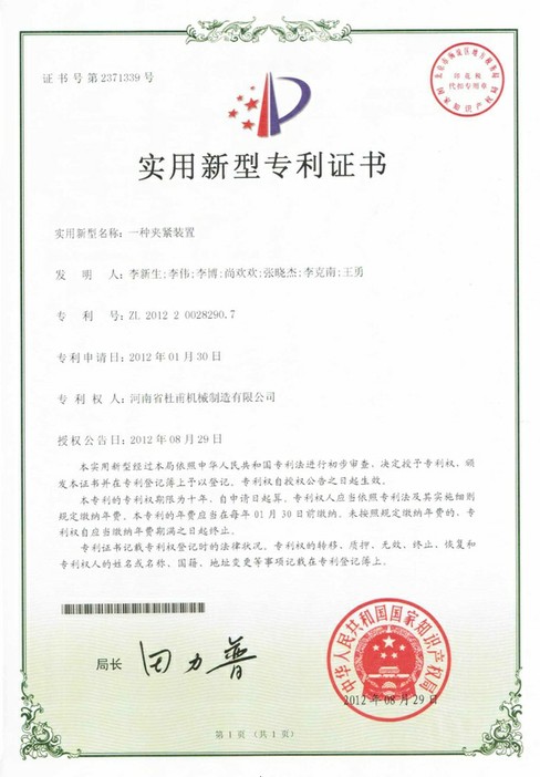 實用新型專利證書--銘澤機械